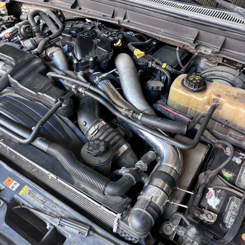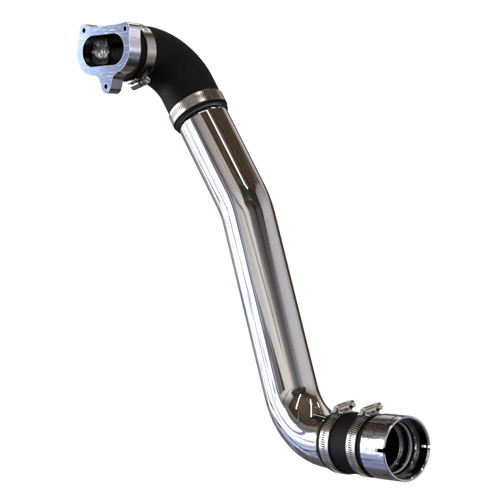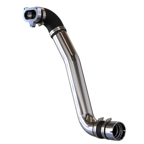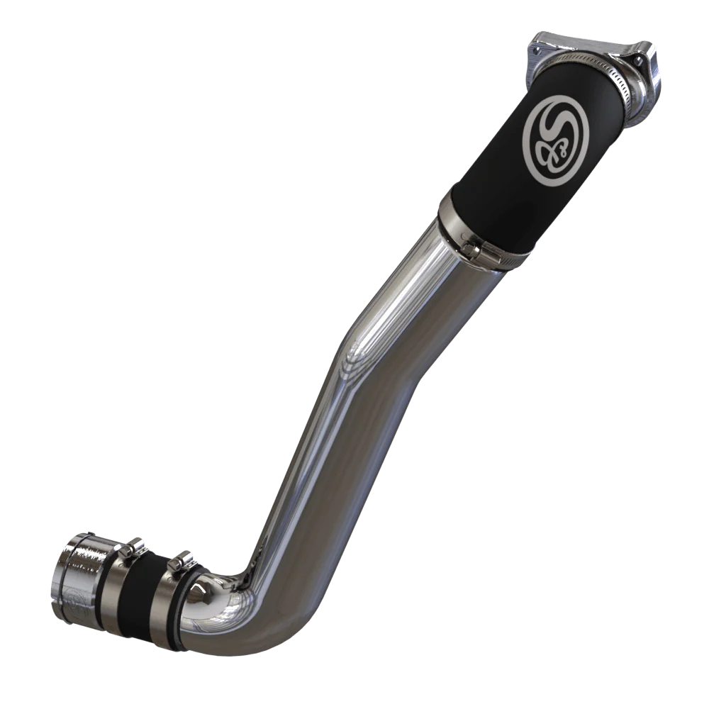 The aluminum S&B Upper Coolant Pipe (radiator pipe) for the Ford Powerstroke 6.7L features billet ends, silicone couplers, mandrel bent pipe, and connects with stainless steel hose clamps with a sealing liner. These are significant improvements over the factory plastic pipe, which is prone to cracking, leaking and failure.